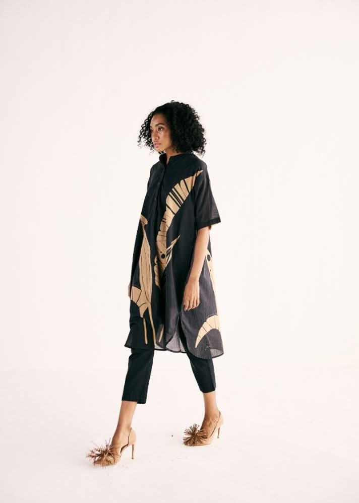 No Return No ExchangeA charcoal black floral printed kurta with front button opening crafted in soft cotton mul paired with cotton mul pencil pants with elasticated back and front zipper opening with a button fastening. Kurta Set Handcrafted in India. Fully Lined Side seam pockets