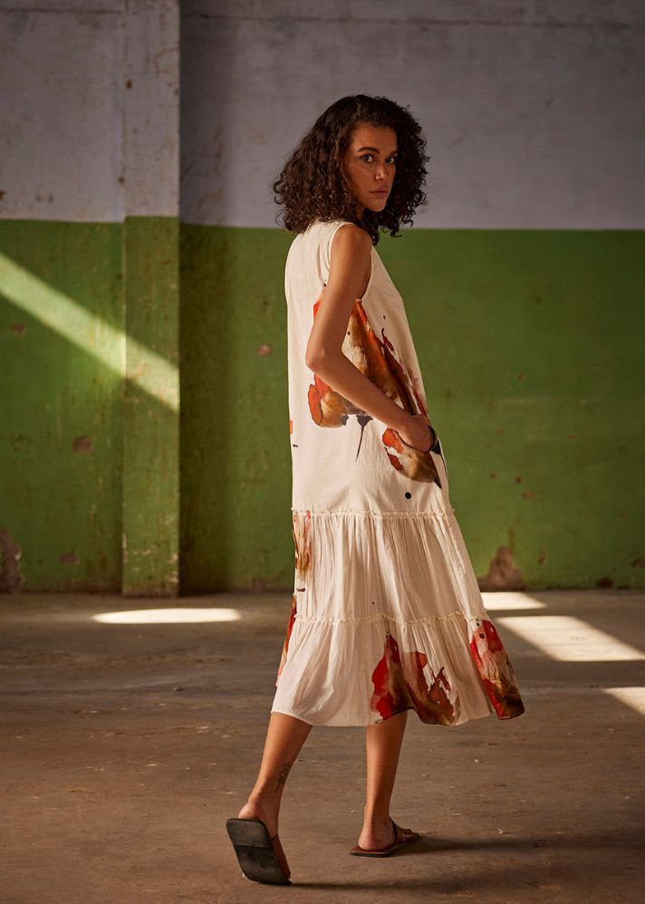 No Return No ExchangeAn off-white art print midi mul dress with a V neckline, gathers at the shoulder and frilled tiered panels. - Handcrafted in India. - Lined bodice. - Side seam pockets.
