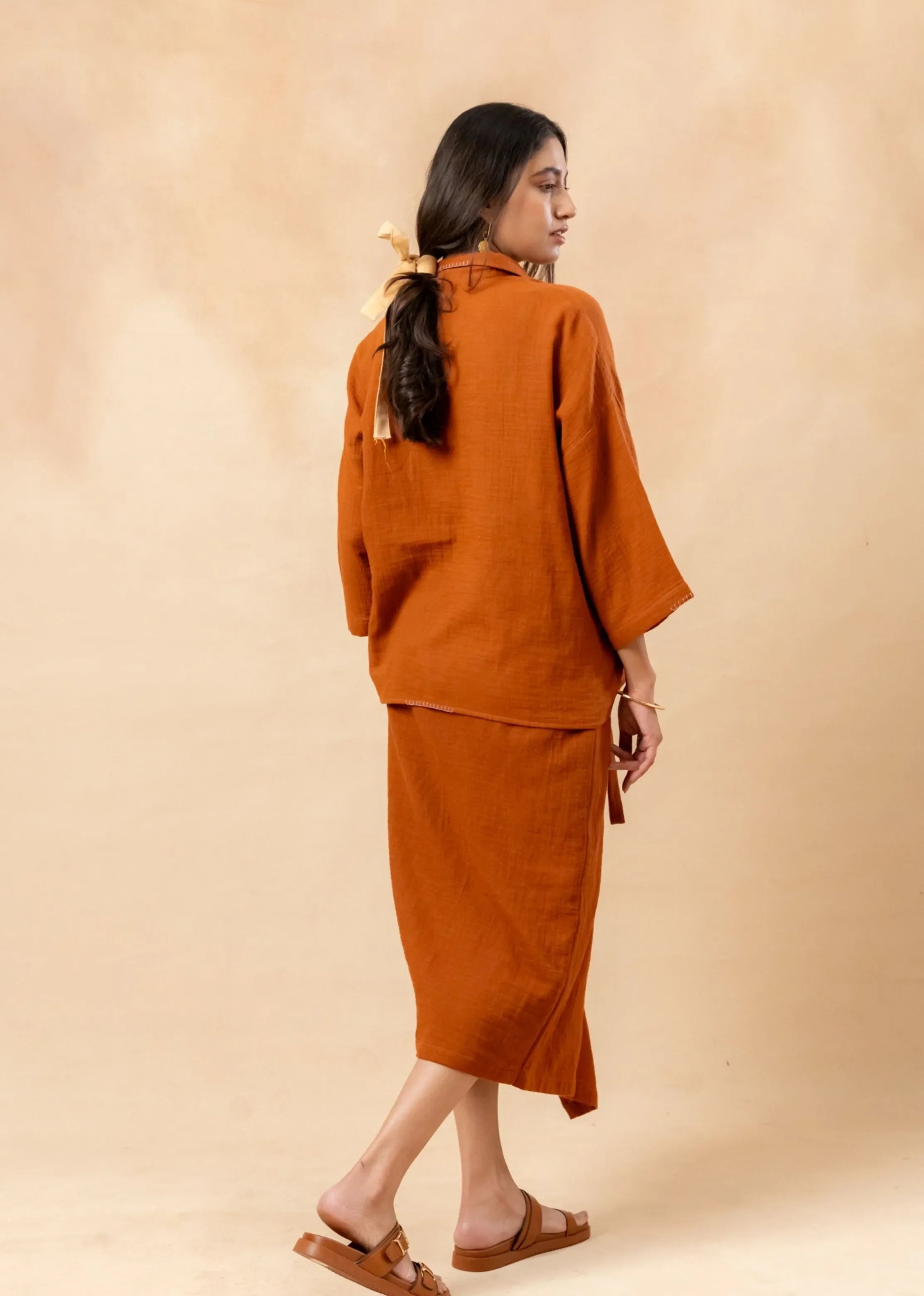 This set includes an oversized boxy shirt with details on the collar and sleeve, paired with an asymmetric, adjustable tie skirt featuring a side pocket. Together, they offer a chic and versatile look for any occasion. Each piece may come with an extra patch or embroidery to save as much fabric as we can.
