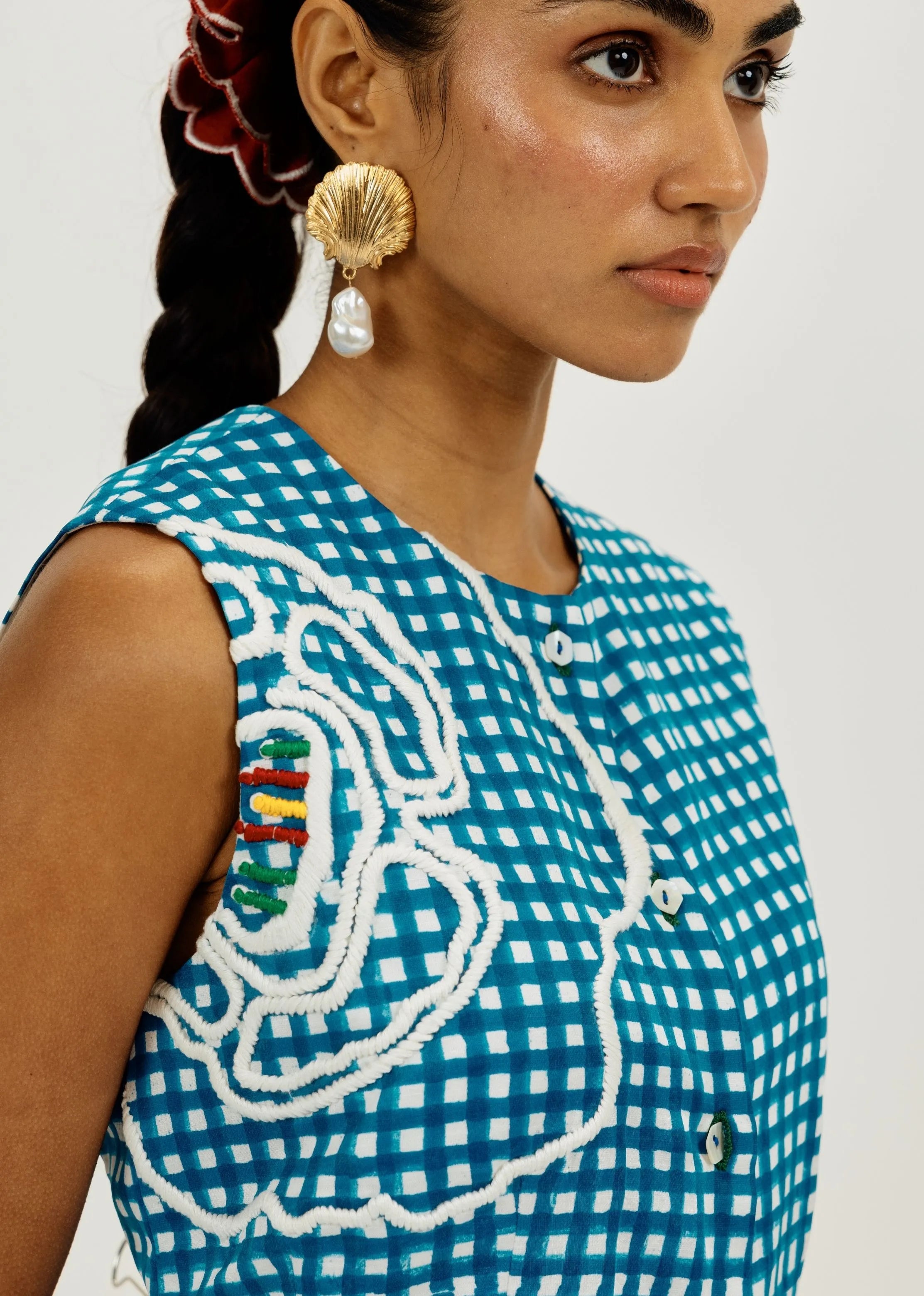 Say hello to our power vest moment. Tailored in structured hand-block printed checks, this sleeveless number is elevated with bold thread-appliqué florals and playful pops of hand embroidery. The fitted silhouette and curved hem make it ideal for layering or wearing solo as a statement piece. Our product is hand-block printed in Jaipur, India, using techniques of traditional handblock printing. Subtle variations in patterns are natural to this process. We believe this makes each creation unique and charming. Some call it je ne sais quoi. We call it JODI. If you wish to have the length of the garment altered, please mention your request in the special instructions section at checkout, with your desired length, customisation charges may apply. .