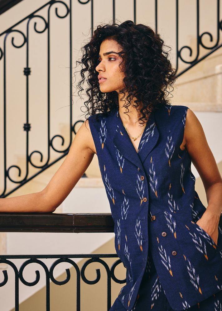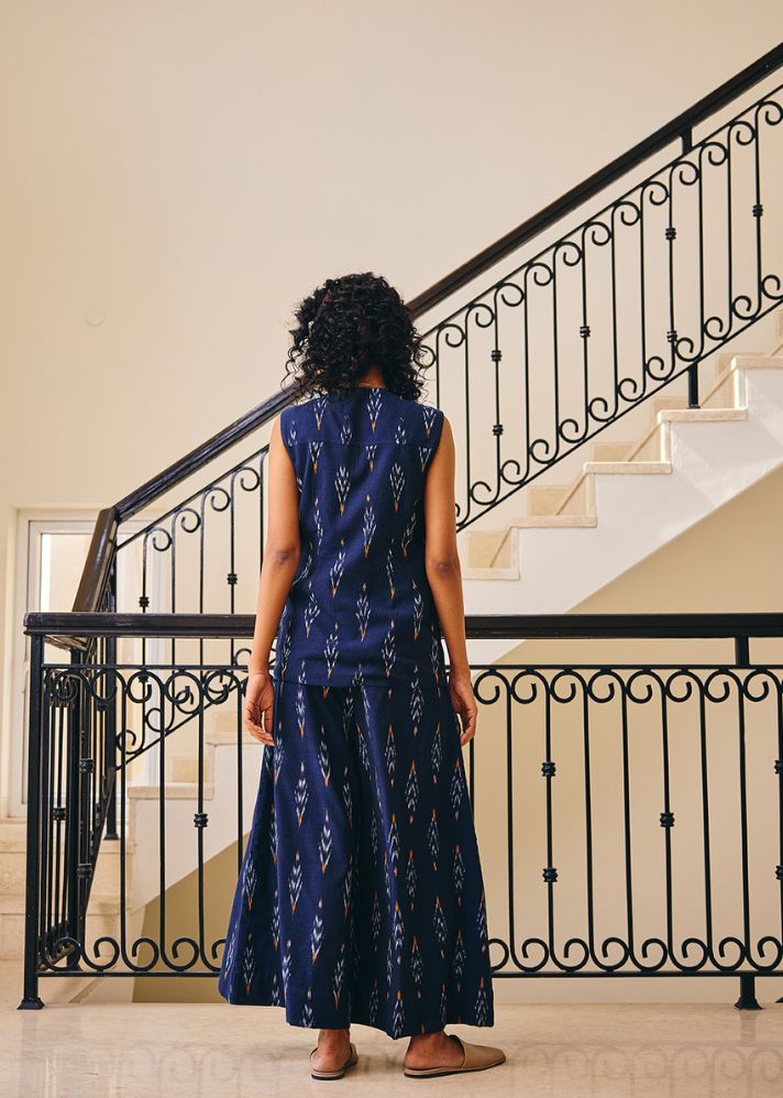 No Return No ExchangeA deep blue ikat co ord set , the top features a notched lapel and front button opening. comes with flare bottoms with side seam pockets. Handcrafted in India. Side seam pockets. Fully lined.