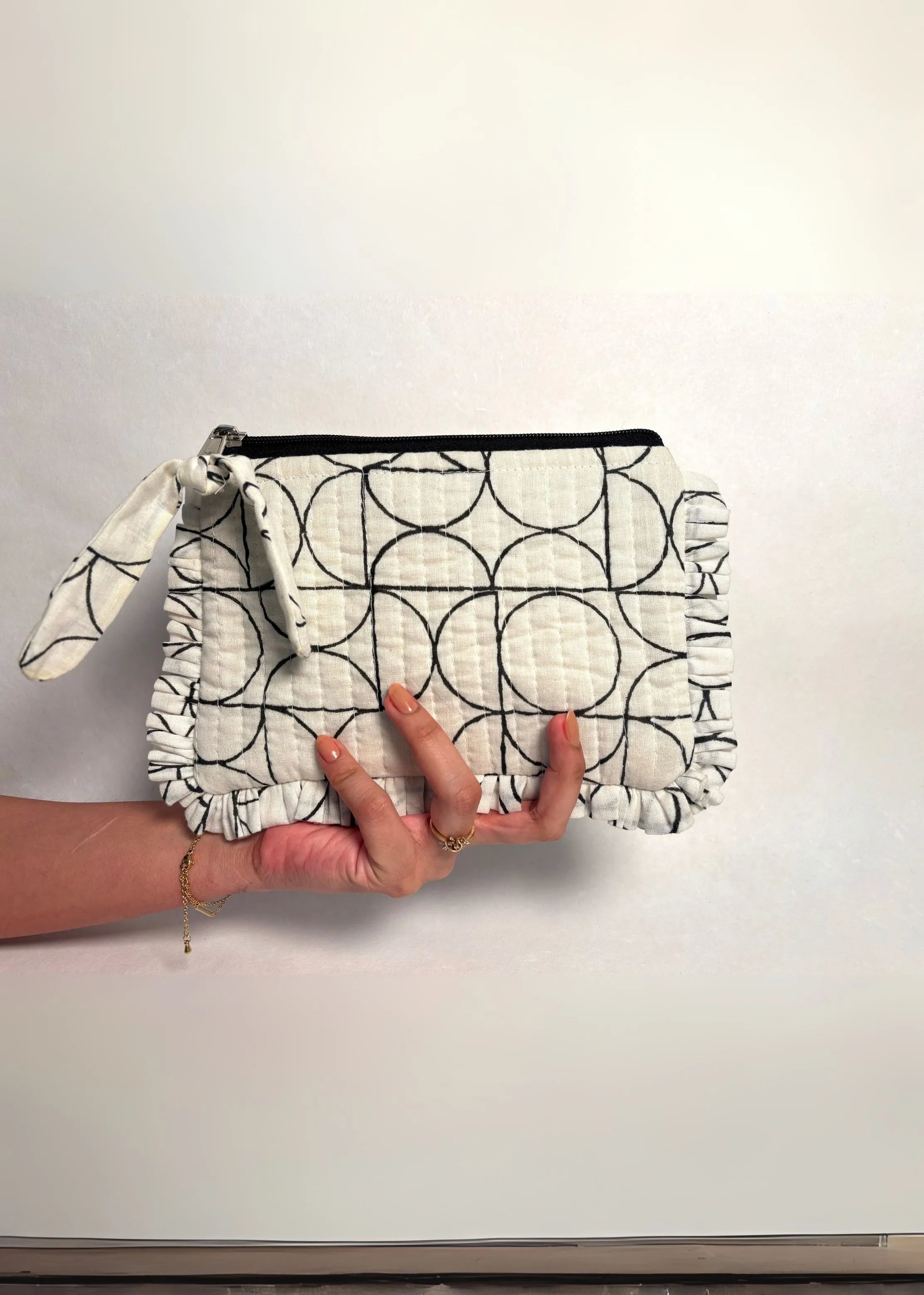 Introducing our Travel Pouch and Organizer Kit Set, designed for the discerning traveler seeking both style and functionality. Each piece is meticulously crafted from quilted cotton, featuring a charming art deco print in black and white. Say goodbye to travel clutter as these pouches keep your essentials neatly organized, whether it's toiletries, tech accessories, or travel documents. Stay organized and travel with flair wherever you go! The Classic Pouch: Organise your travel essentials such as toiletries, charging cables, skincare products and fit in your bag. General Care: Handwash with mild soap Assembly: None required. Simply start styling your table Dimension: 6.5" x 5.5"