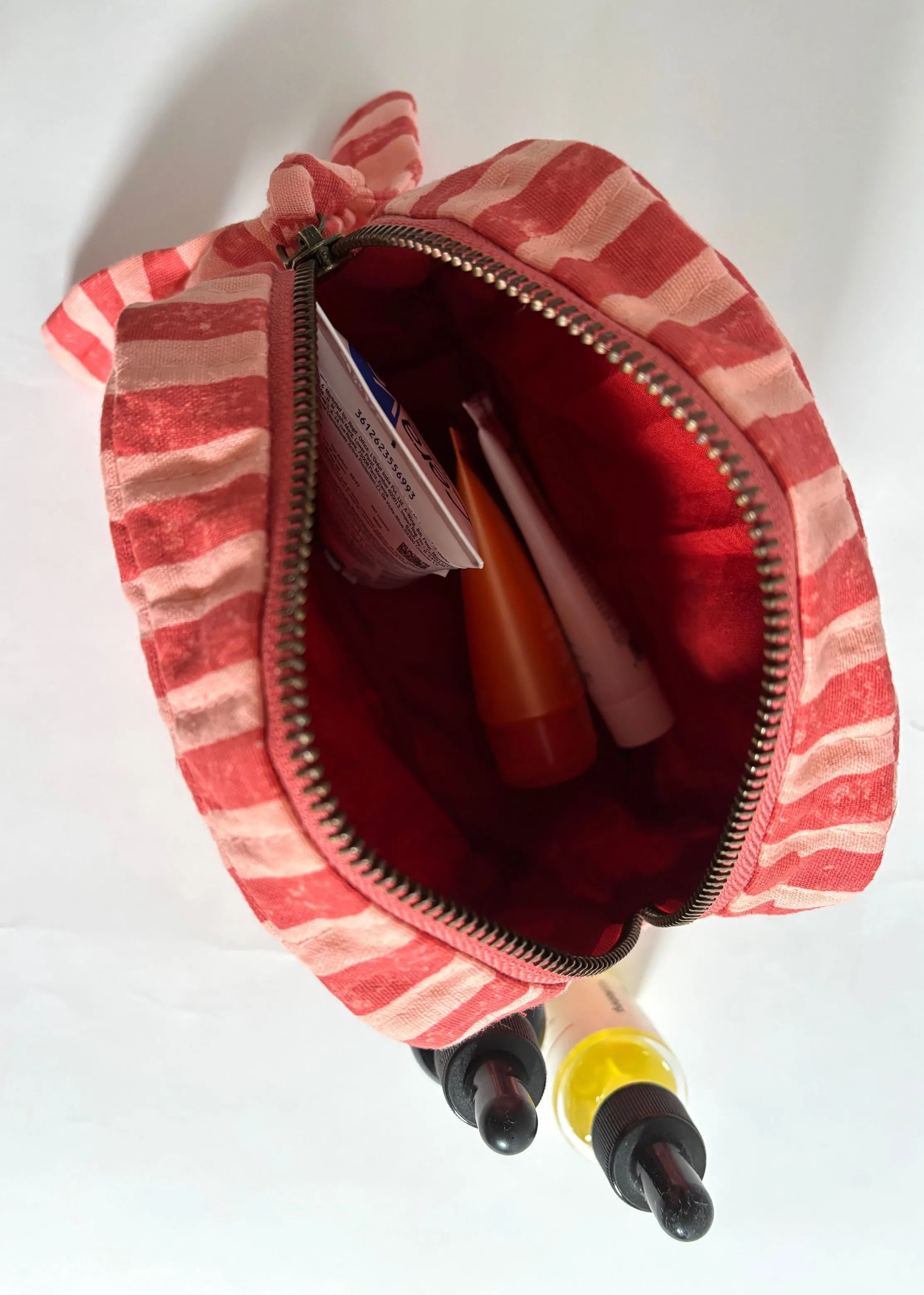 Introducing our new collection, Valentines Special Travel Pouch and Organizer, designed for the discerning traveler seeking both style and functionality. Each piece is meticulously crafted from quilted cotton, featuring a charming pink & red stripes on cotton flex. Say goodbye to travel clutter as these pouches keep your essentials neatly organized, whether it's toiletries, tech accessories, or travel documents. Stay organized and travel with flair wherever you go! The Classic Pouch: Organise your travel essentials such as toiletries, charging cables, skincare products and fit in your bag. General Care: Handwash with mild soap Assembly: None required. Simply start styling your table Dimension: 6.5" x 5.5"
