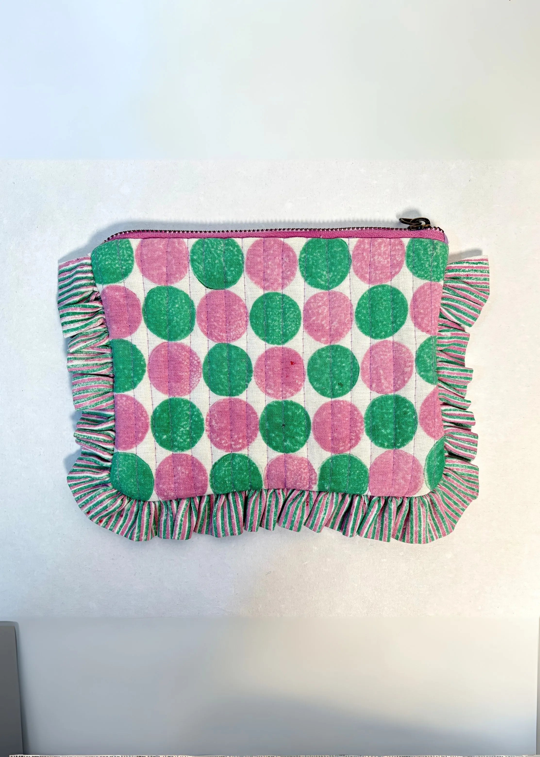 Introducing our Travel Pouch and Organizer Kit Set, designed for the discerning traveler seeking both style and functionality. Each piece is meticulously crafted from quilted cotton, featuring a charming polka print in purple and green. Say goodbye to travel clutter as these pouches keep your essentials neatly organized, whether it's toiletries, tech accessories, or travel documents. Stay organized and travel with flair wherever you go! The Flat Frill Pouch: Store lip balm, keys, earphones, small cosmetics or slip into your purse or backpack. General Care: Handwash with mild soap Assembly: None required. Simply start styling your table Dimension: 8" x 5"