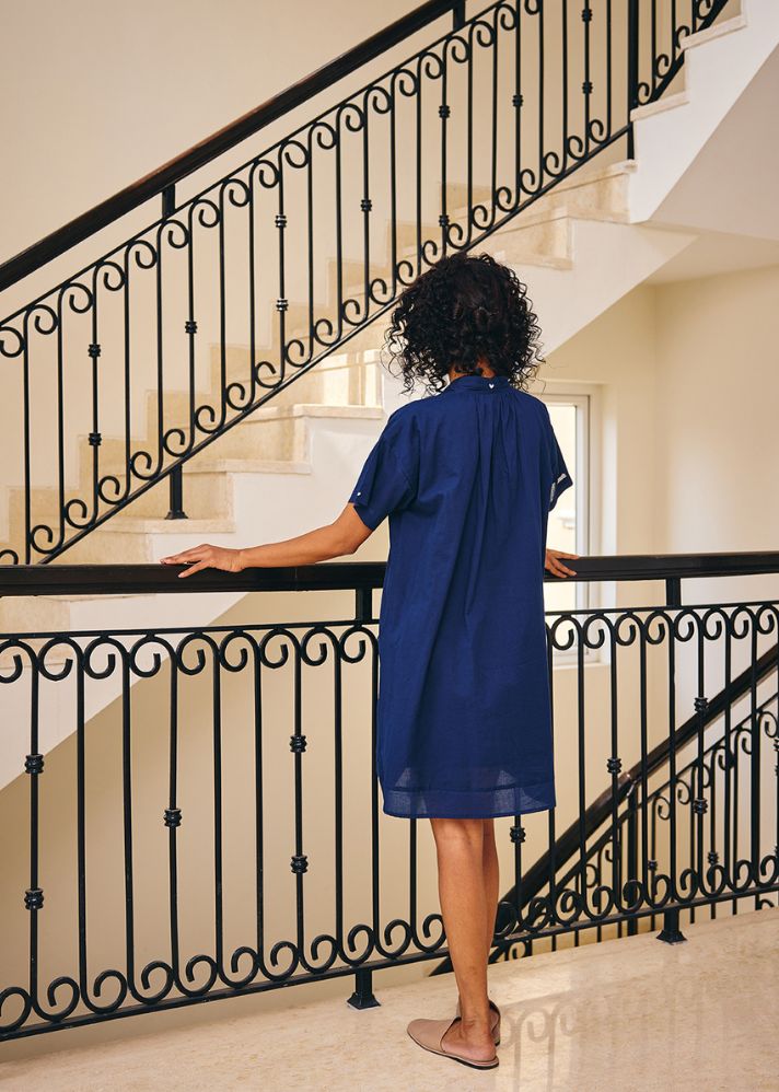 No Return No ExchangeA deep blue relaxed fit dress featuring a v neckline crafted in soft cotton mul Created to mirror the fire within. Handcrafted in India Side seam pockets Separate cold water hand wash. No soaking. Or dry clean .