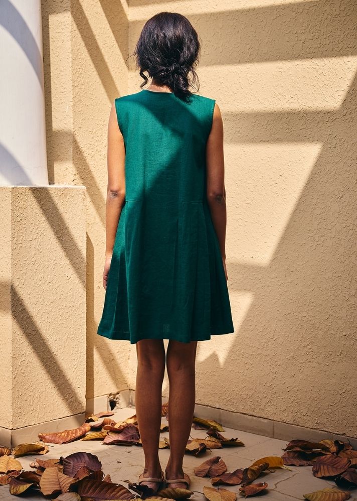 No Return No ExchangeBold is beauty woven into the stregth midi. This emerald green box fit dress is crafted in linen. Handcrafted in India Front button opening Side pockets