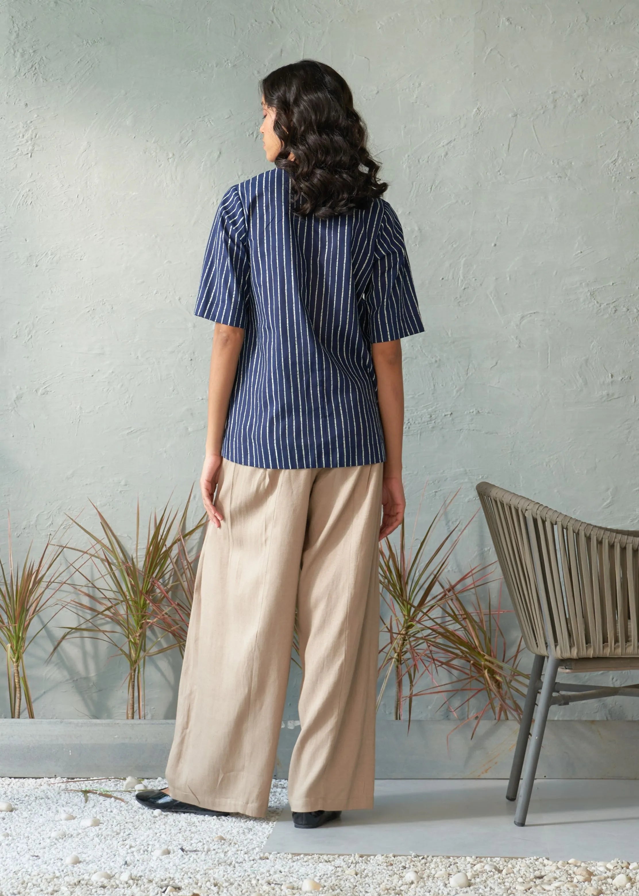 Stay effortlessly chic with the Tidelines Hi-Lo Top, a versatile piece crafted from lightweight cotton for ultimate comfort. Featuring a classic indigo stripe print, this round-neck top comes with a stylish front placket and elbow-length sleeves for a relaxed yet polished look. The hi-lo hemline adds a modern twist, making it perfect for pairing with jeans, trousers, or skirts. A wardrobe essential for casual outings and breezy days.