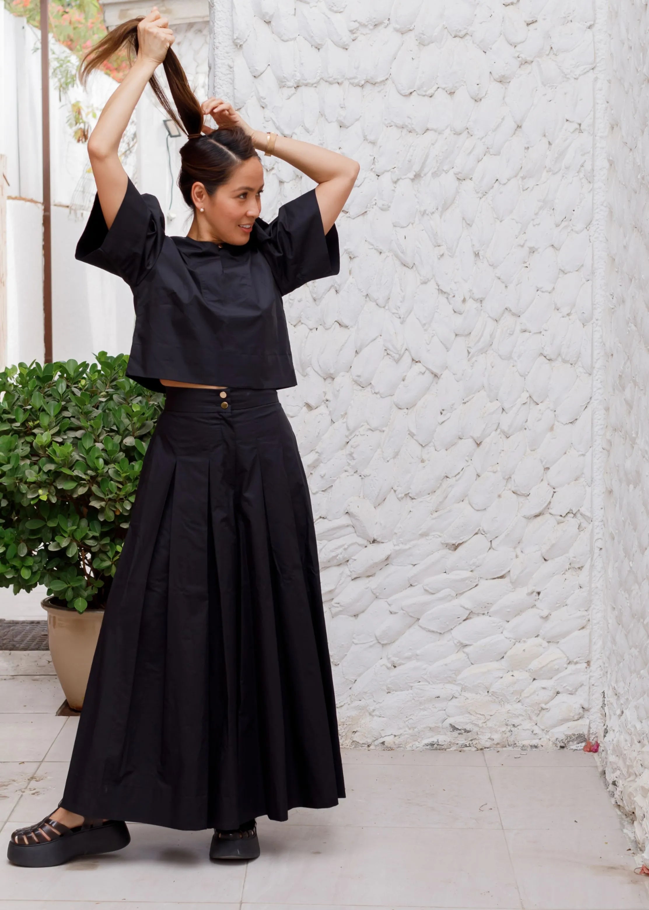 The Tulip Organic Cotton Set is all about effortless style and comfort. The high-waisted pants have elegant box pleats and stylish gold button details, giving them a refined look. They also feature handy pockets and an elastic back for a flexible, comfortable fit. Made from 100% GOTS-certified organic cotton poplin, the fabric feels soft on your skin while being kind to the planet. Each piece is carefully handcrafted in the UAE, ensuring quality and sustainability.