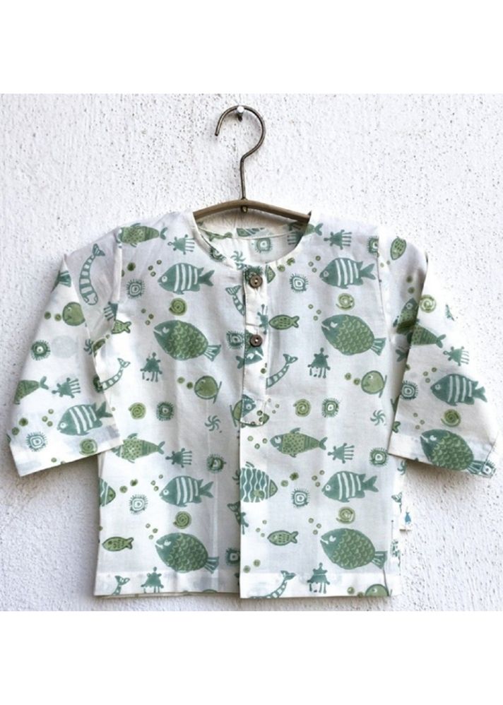 1 x kurta top: 100% organic cotton, the fish print is hand-block printed in GOTS certified azo-free colours. Wooden button closures and flat seams for ease of wearing and fit. 1 x pants: 100% organic cotton dyed with GOTS certified azo-free colours. Elasticated waistband and bottom hem.