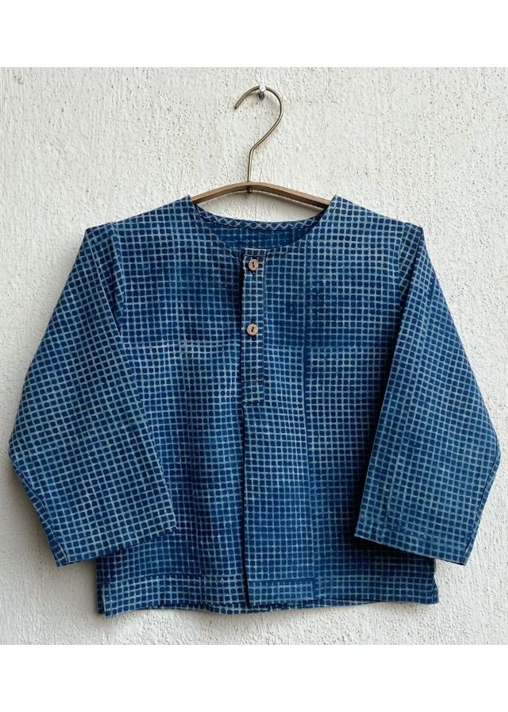 1 x kurta top: 100% organic cotton, the indigo checks is hand-block printed by Ajrakh artisans in rural Gujarat. Wooden button closures and flat seams for ease of wearing and fit. 1 x pants: 100% organic cotton. Handblock printed using naturally hypoallergenic indigo colour. Elasticated waistband and bottom hem for easy pull and stay.