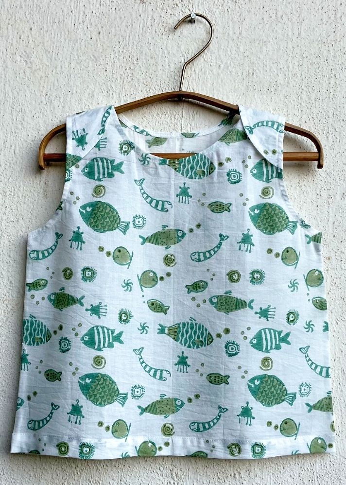 Set contains: 2 x jhabla tops: 100% organic cotton sleeveless tops with envelope neck for hassle-free wearing. All-over handblock printed patang or kite design in the colour of sunshine is accompanied by fishes in cool mint. Part of our Little Koi wants to fly poem collection. Conscious of minimising waste, the set is packed in a reusable muslin bag with an interactive paper game tag, ready for gifting.