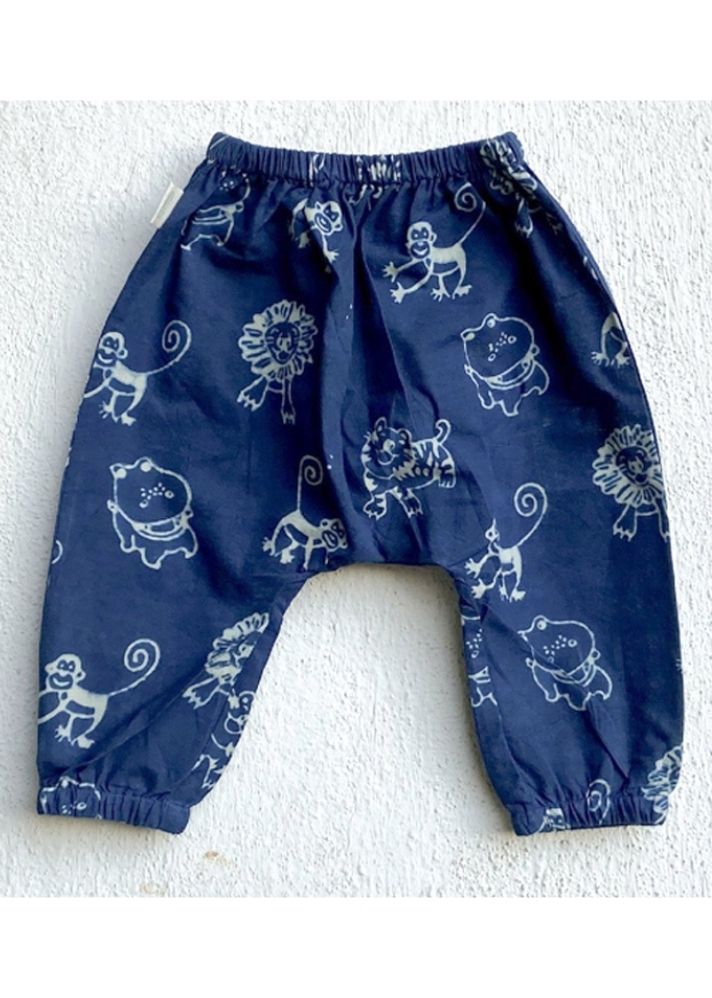 1 x pants: 100% organic cotton hand-block printed by traditional Ajrakh artisans in naturally hypoallergenic indigo colour. Elasticated waistband and bottom hem.