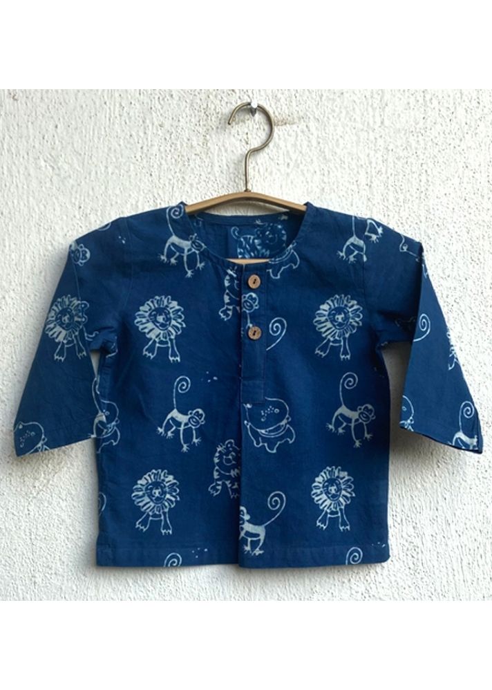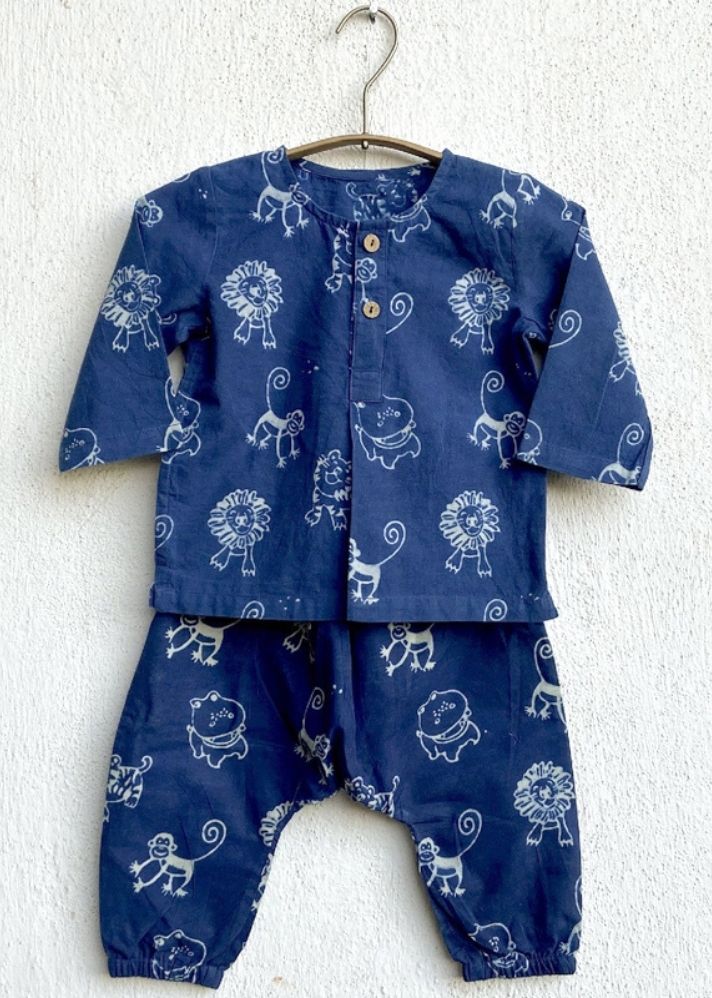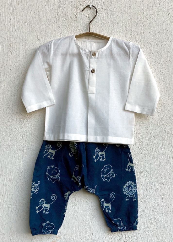 This gender-neutral gift set contains: 2 x kurta tops: 100% organic cotton. One undyed white and one zoo hand block printed top created by traditional Ajrakh artisans in naturally hypoallergenic indigo colour. Wooden buttons closures and flat seams for ease of wearing and fit. 1 x pants: 100% organic cotton matching printed indigo pants with elasticated waistband and bottom hem.