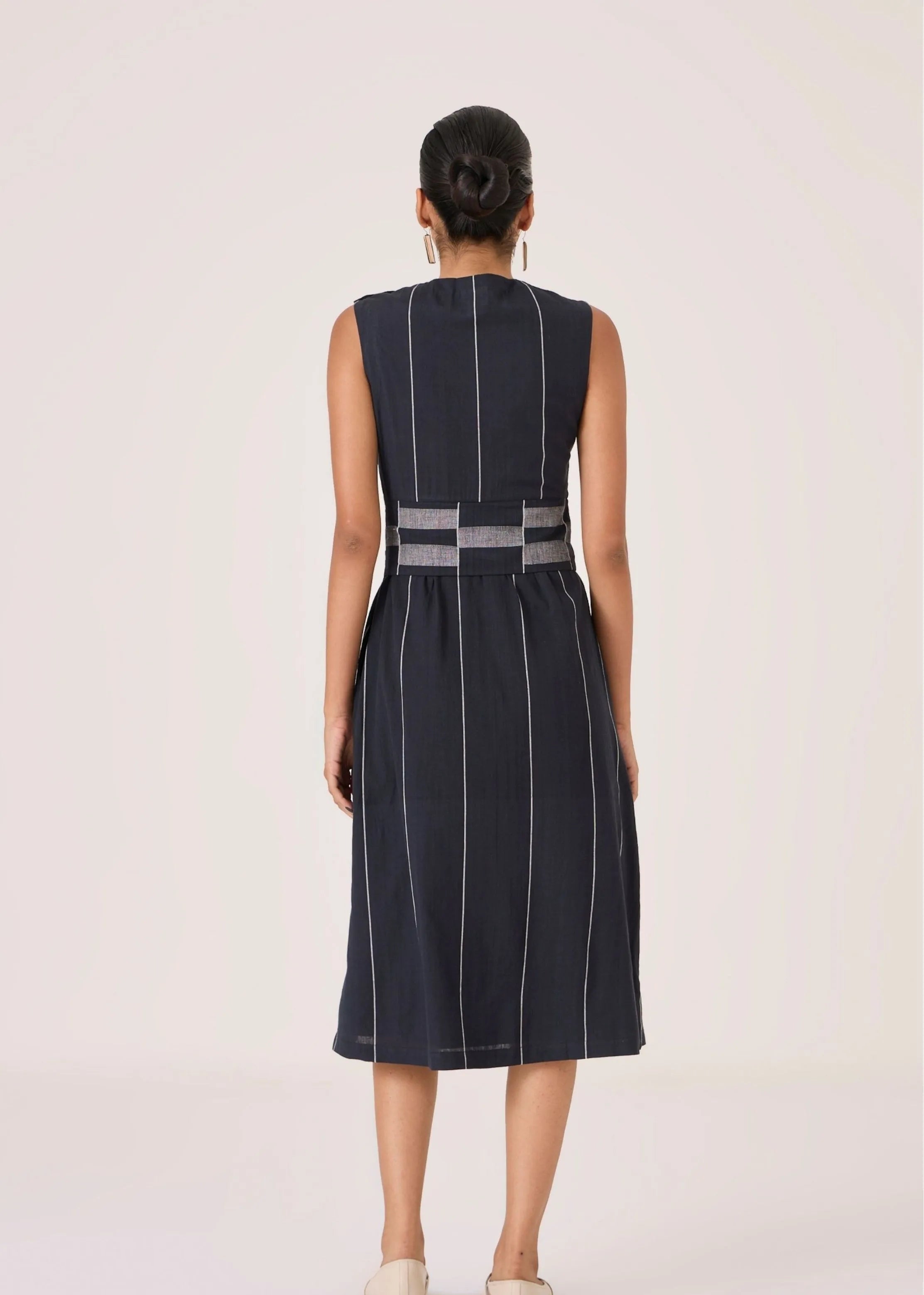 - Sleeveless midi dress - Indian heritage textile - Angular overlap panel with geometric Jamdani border - Shoulder button closure - In-seam pockets - Side zip - This dress is fully lined