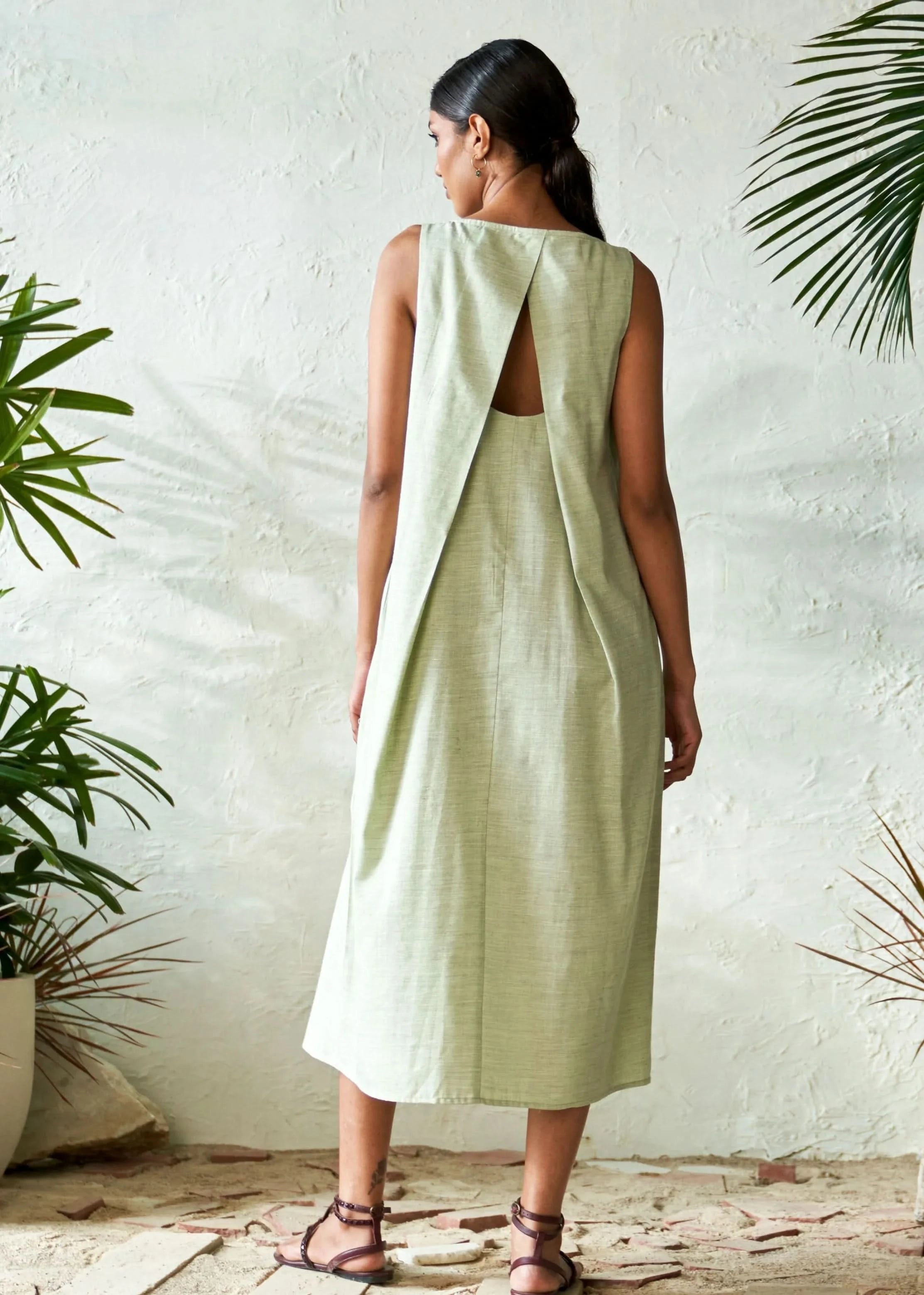 levate your wardrobe with our sophisticated lavender midi dress, designed with a U scoop neck and distinctive box pleats in the front for a structured yet elegant look. The overlapping back panel with a keyhole detail adds a touch of modern chic and allure. Crafted from high-quality fabric, this dress offers a flattering silhouette that gracefully falls to midi length, perfect for a variety of occasions. Whether for a formal event or a stylish evening out, this versatile dress combines timeless elegance with contemporary design elements.